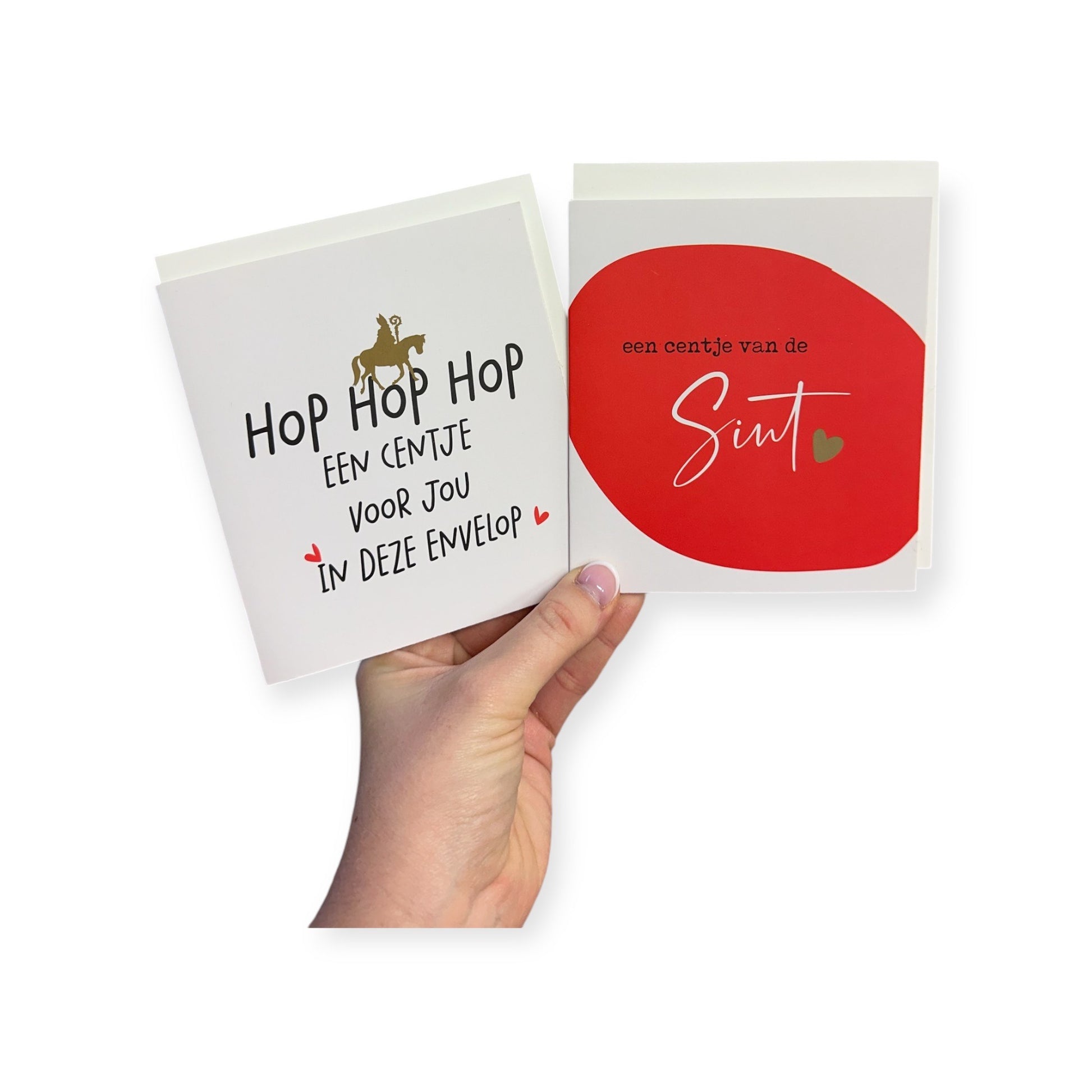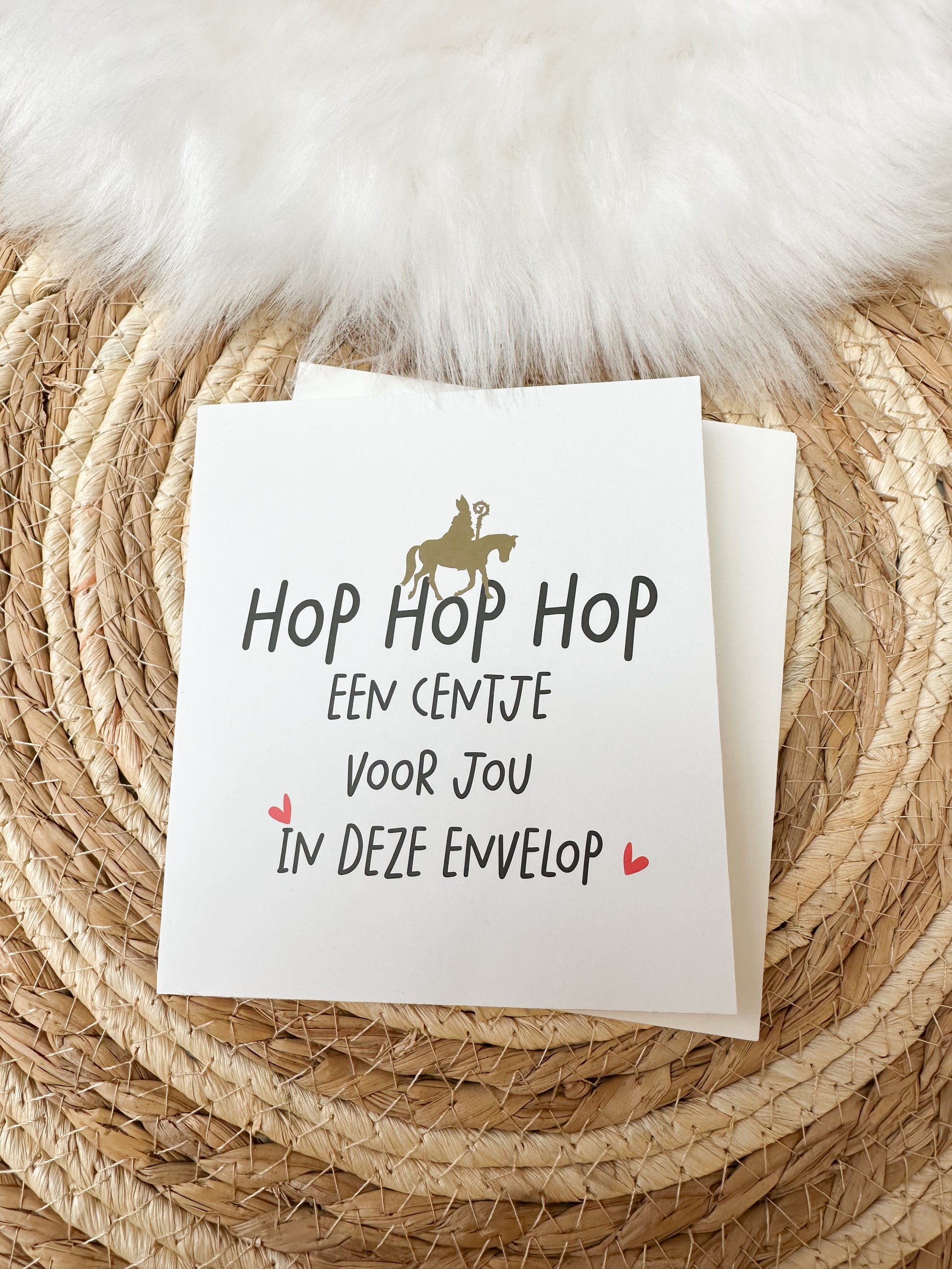 Wenskaartje met enveloppe om geld in te steken. Binnenin is een leuk flapje voorzien met een aangepaste tekst. Geef er een chocolade figuurtje bij en je hebt een Sint-Maartengeschenk voor de grote kinderen :)