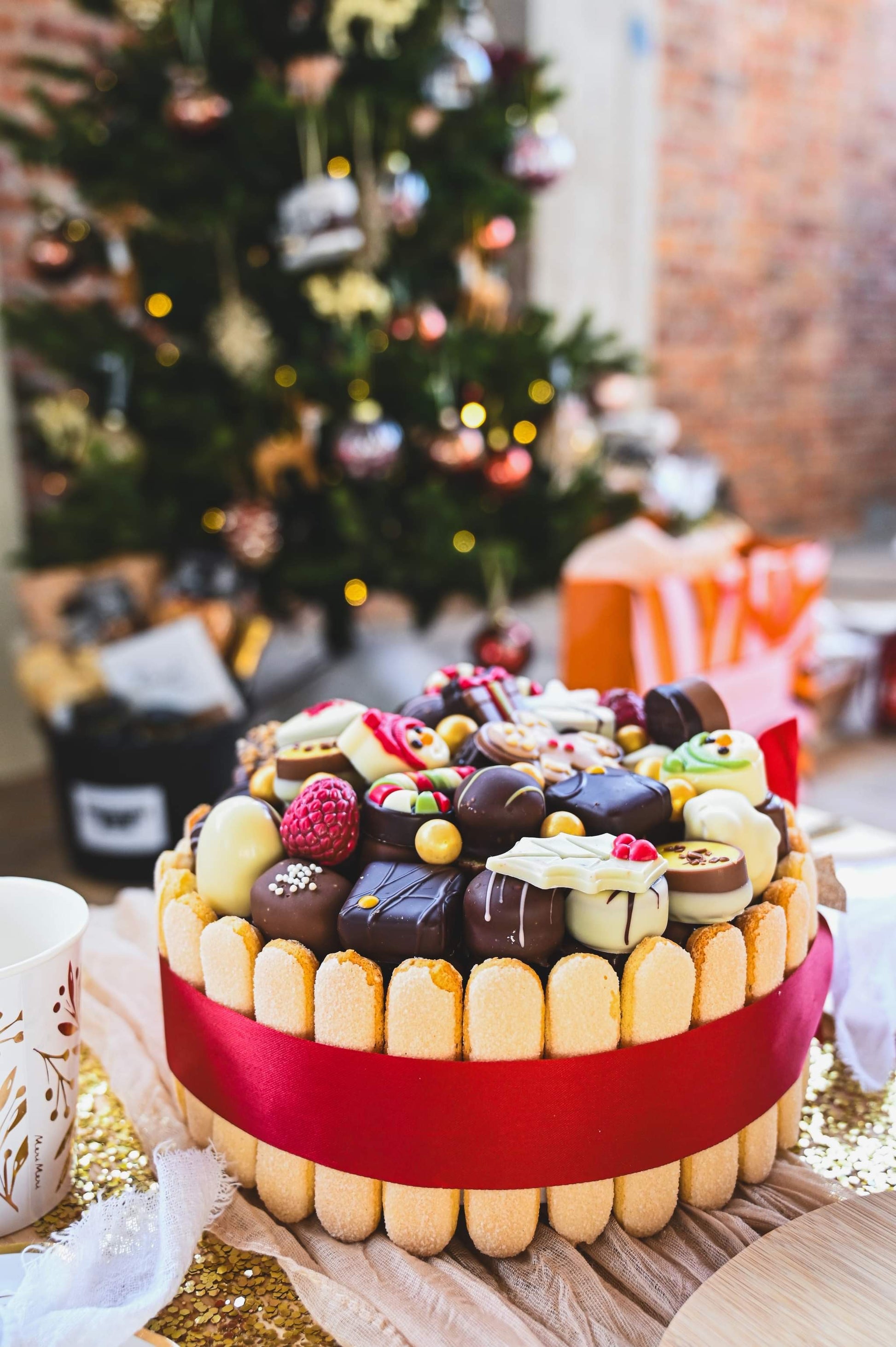 Onze pralinetaarten zijn een echte blikvanger én een ware traktatie voor elke chocoladeliefhebber. Ze bestaan uit een bodem van chocoladeparels, omringd door heerlijke koekjes, en rijkelijk gevuld met een selectie van onze meest verfijnde pralines. Afgewerkt met leuke kerstfiguurtjes voor een extra feestelijk accent.