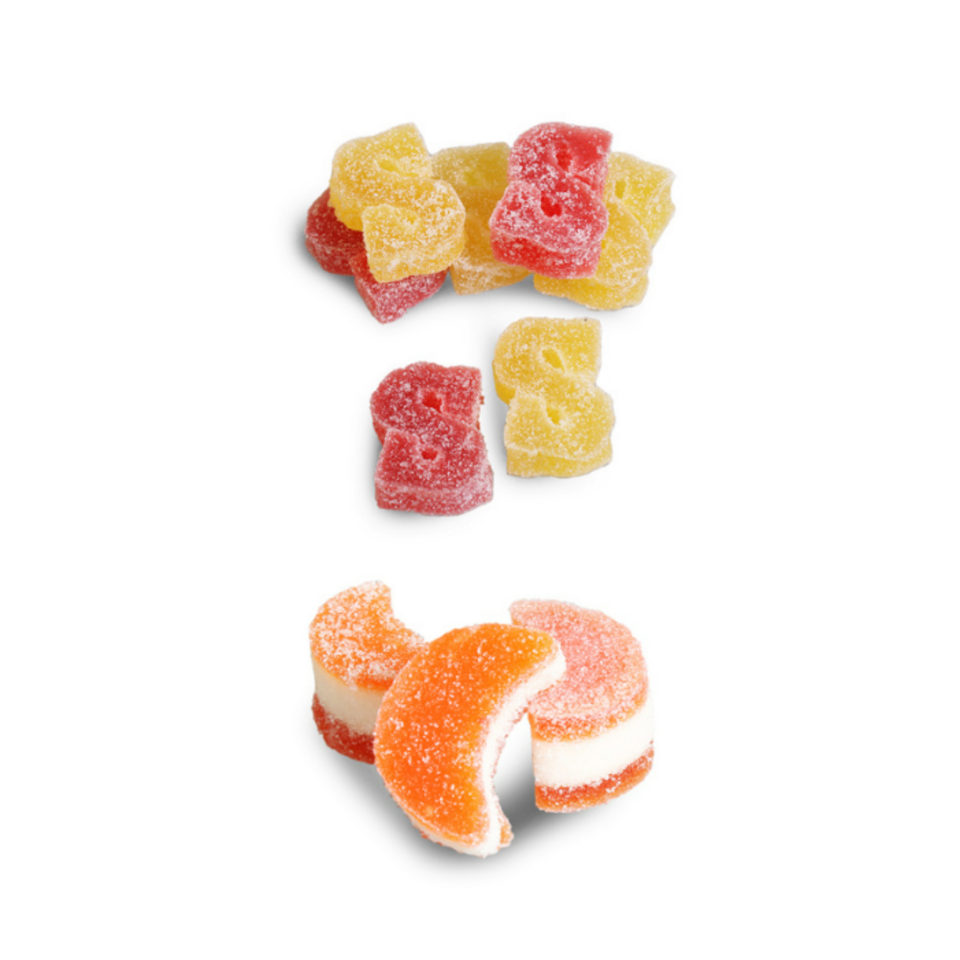 Zakje gevuld met ambachtelijke gommen, zachte snoepen in de vorm van de letter 'S' of in de vorm van mandarijnstukjes.