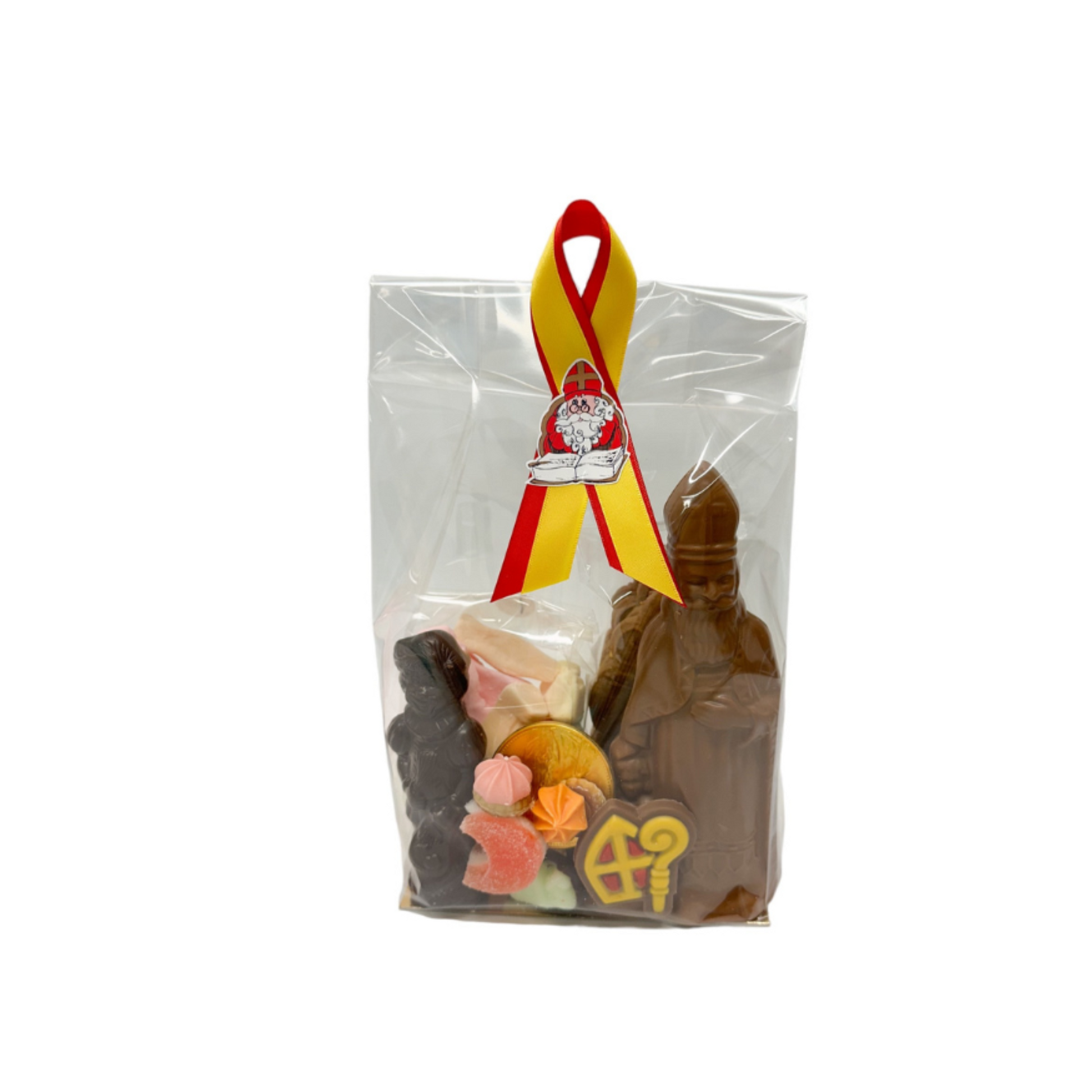 Doorzichtige zak gevuld met allerlei Sintlekkers: holgoed figuur melk 18 cm, holgoed figuur fondant 12 cm, zakje lieve vrouwtjes guimauve, pakje met 4 speculaaskoeken, platte chocolaatjes, mandarijngom, sintfiguur 12 cm met praliné, chocolade nicnacjes, sintpenning en suikerfondant.