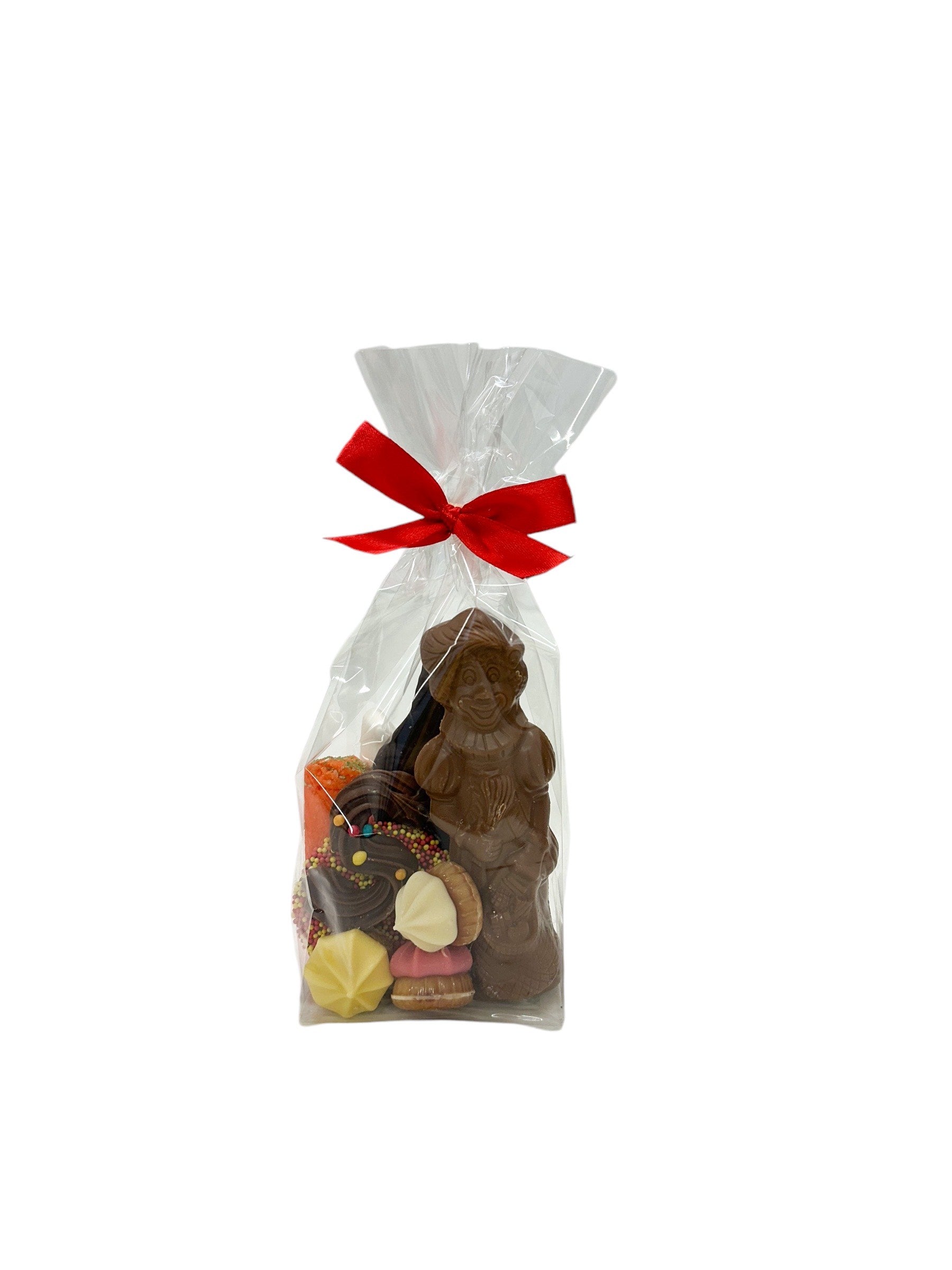 Inhoud zakje: een holgoed figuurtje, lieve vrouwtjes guimauve, sintguimauve met chocolade, een kokosworteltje, platte sintchocolaatjes en opgevulde chocolade nicnac's.
