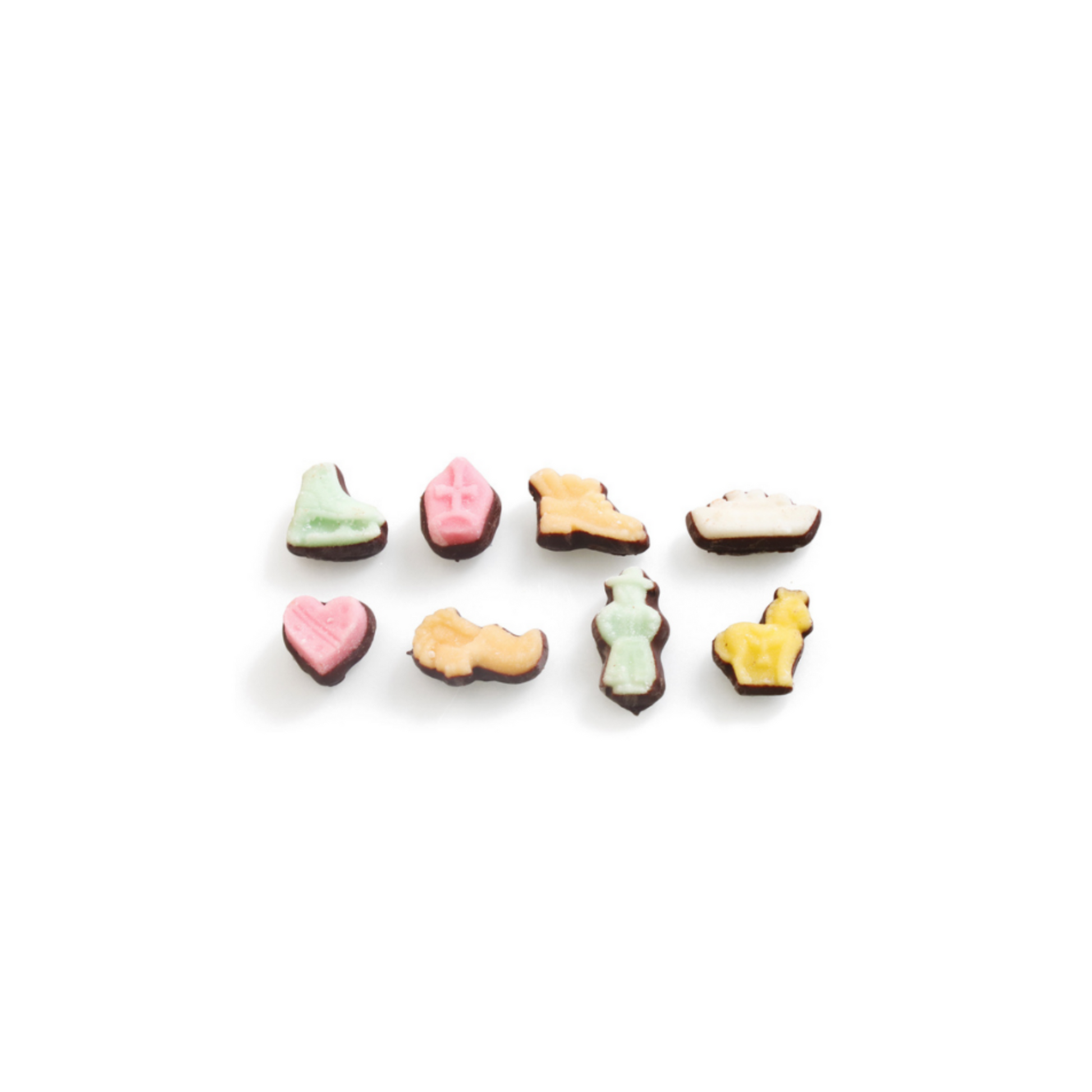 Zakje gevuld met 200 gram suikerfondant Sintfiguren, de voet is overgoten met chocolade.