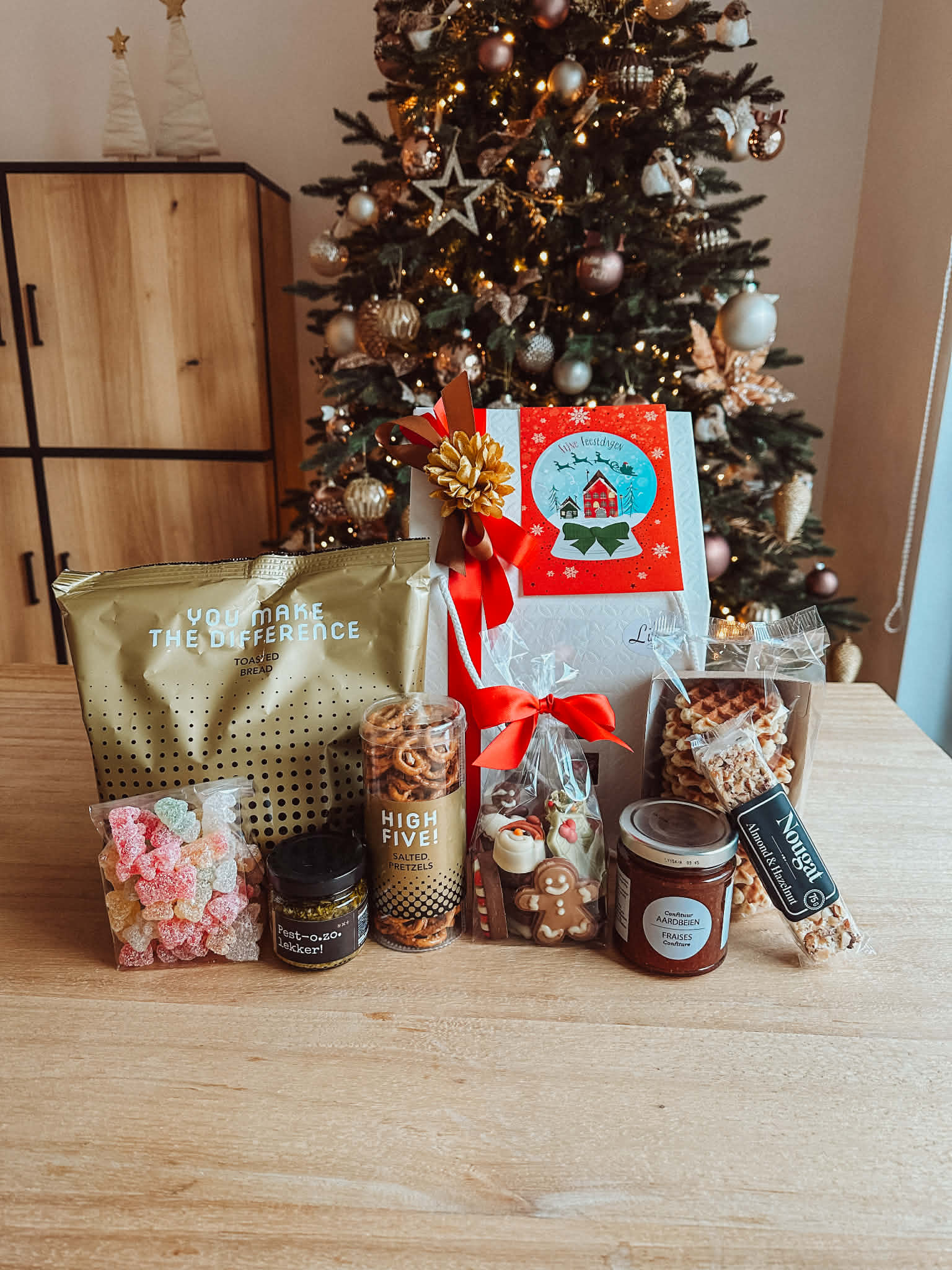 Inhoud: zak met geroosterde toastjes, potje groene pestodip, doosje met pretzelkoekjes grof zeezout, pak boterwafels vanille, nougatreep, chocolade figuurtje rendier, zure beertjes, een pot aardbeiconfituur en een zakje gemengde kerstpralines/chocolaatjes.